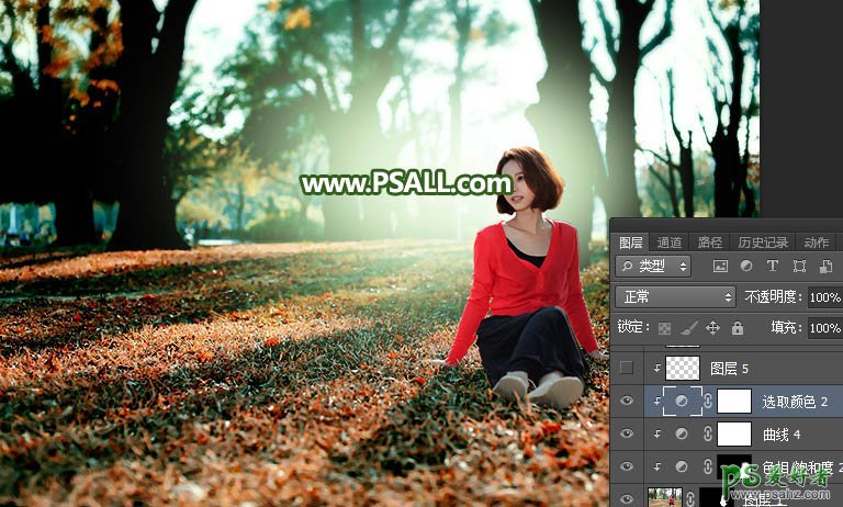 PS调色教程:给树林中的红衣美女性感照片调出逆光暗调青红色效果