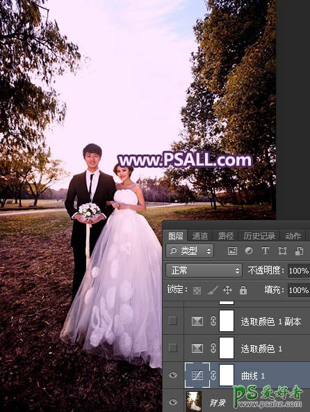 Ps婚纱照调色:给秋景树林中拍摄的情侣婚片调出浪漫的紫色霞光
