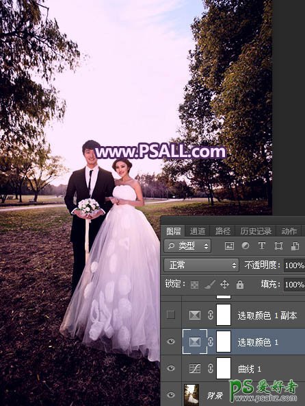 Ps婚纱照调色:给秋景树林中拍摄的情侣婚片调出浪漫的紫色霞光