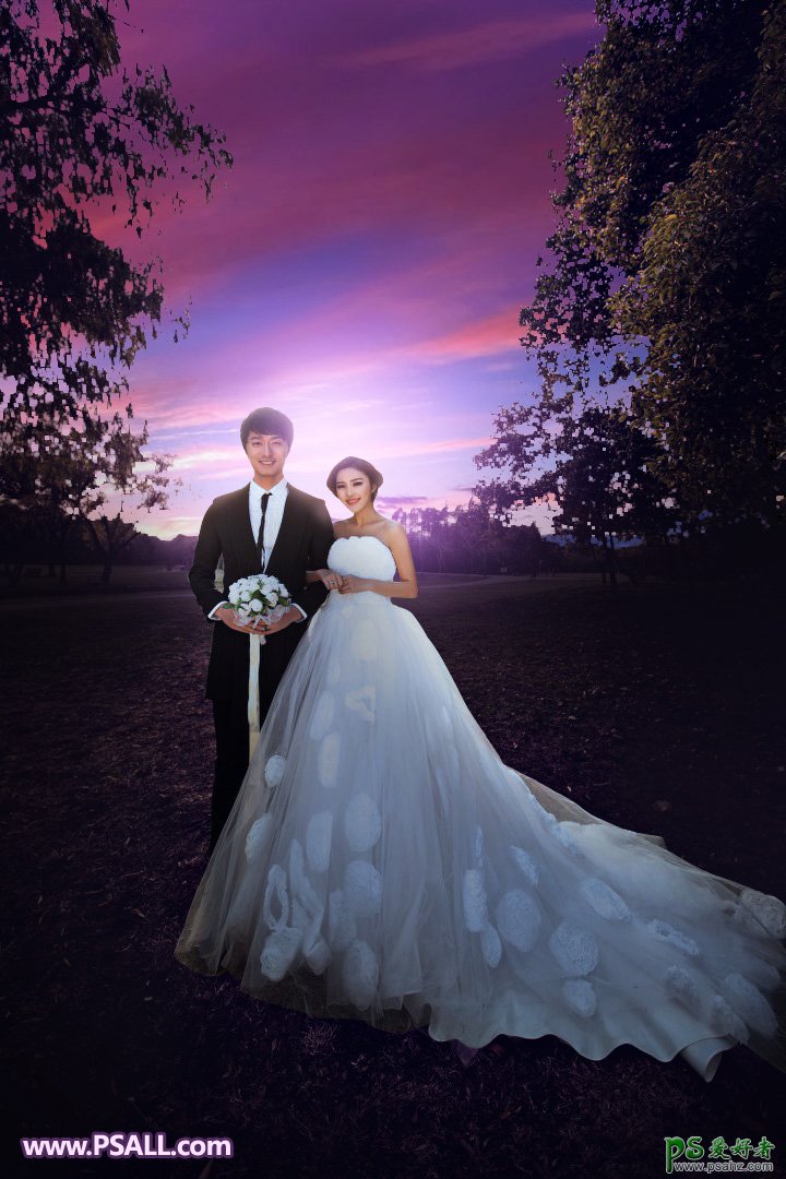 Ps婚纱照调色:给秋景树林中拍摄的情侣婚片调出浪漫的紫色霞光