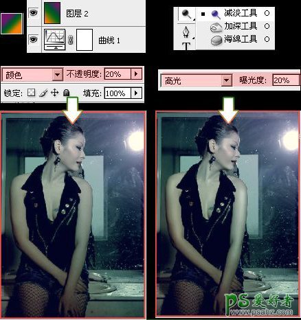 第四步,用白色柔角画笔调整大小在灯光处打上光,注意用蒙板把打到脸上的擦去,再用黑色画笔在左下角和左上角右下角处刷出暗角