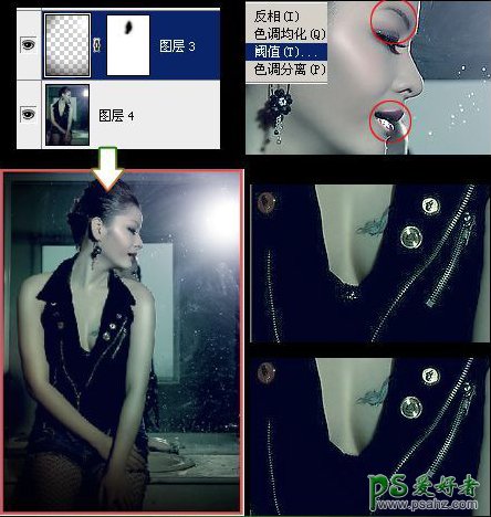 用加深工具加深眉毛,再用钢笔工具把嘴唇轮廓勾出来,羽化2像素,ctrl+J复制一层,图像-调整-阈值,图层模式为滤色,把多余的调光用蒙板涂去,使嘴唇更性感一些,再用画笔工具把拉链边的瑕疵修去,如图: