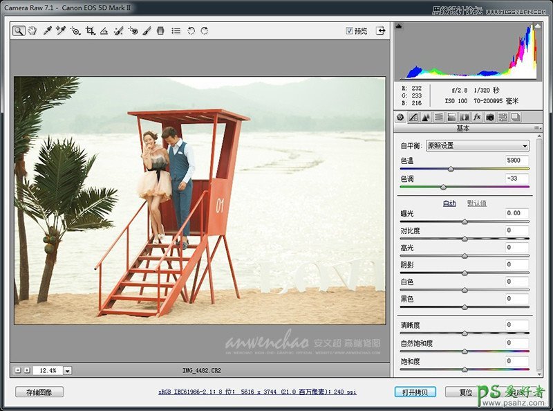 Photoshop给山区水库边拍摄的情侣婚纱艺术照调出暖暖的夕阳景色效果,夕阳效果的制作:首先:夕阳效果的水面色彩和山的受光位置;其次:逆光之后对人物和椰子树产生的逆光效果;再次:添加光线之后的色彩,和光斑的位置; 上部分是调色过程,下部分