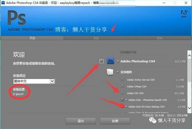 3、如图,选择要安装的产品,支持组件默认就好了,大家注意左下角的安装位置,记住了~ 然后点击安装
