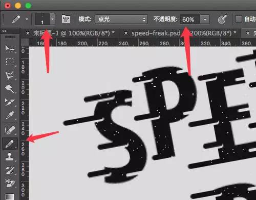 最后我们给文字添加一些纹理,这个纹理相当简单,只需要用1PX的铅笔工具,并通过设置「不透明度」在文字上,画一些点作为纹理。