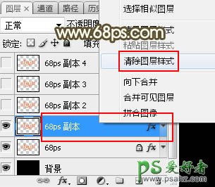 5、按Ctrl + J 把当前文字图层复制一层,然后在文字副本缩略图后面的蓝色区域右键选择“清除图层样式”,过程如下图。