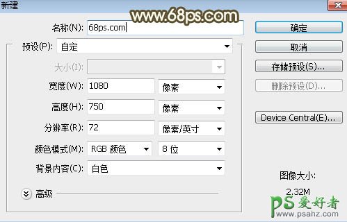 1、打开PS软件,按Ctrl + N 新建画布,尺寸为:1080 * 750像素,分辨率为:72像素/英寸,如下图,然后确定。