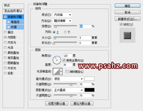 3. 继续添加斜面和浮雕样式,参数如下