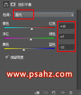 11. 保持选区,创建色彩平衡调整图层,对高光进行调整,参数及效果如下图。