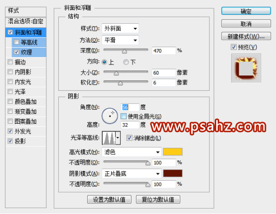 斜面和浮雕:高光颜色为fecb17,阴影颜色为631403