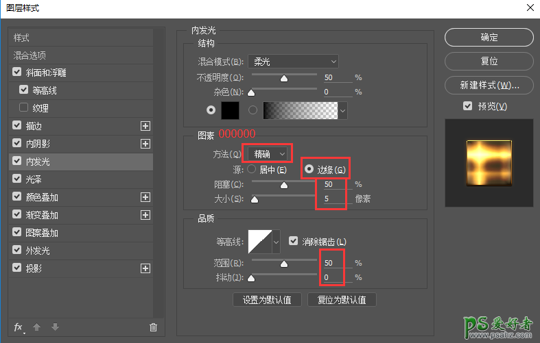 5、内发光,柔光模式,透明度为50%,参数如下图: