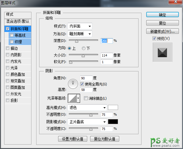 这一步是给字加上立体感,后面在用曲线做广感。只需要做简单的参数设置,让字看起来立体些就行。方式改为“雕刻清晰”,深度和大小随意调整,参数尽量大些,只要让字变得立体棱角分明就行,后面还可以微调。“阴影”选项的高度和角度要调为上方来光,当然大家可以试着调不同的光向效果。我调的参数如下: