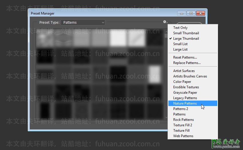 点开编辑“预设管理器”,然后CTRL+5,将预设类型变更为图案。