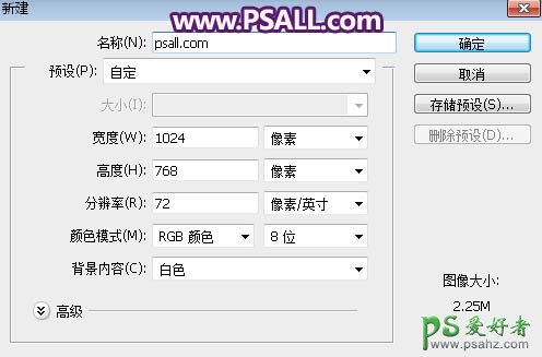 1、新建画布。打开PS软件,按Ctrl + N 新建画布,尺寸如下图,然后确定。