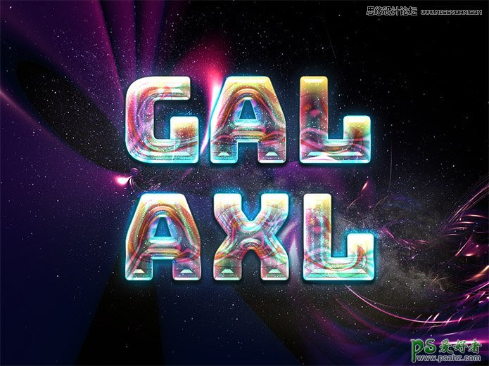 PS个性字效教程:学习制作科技感十足的水晶艺术字,创意字体设计教程,一个明亮的银河星系发光的文字效果。