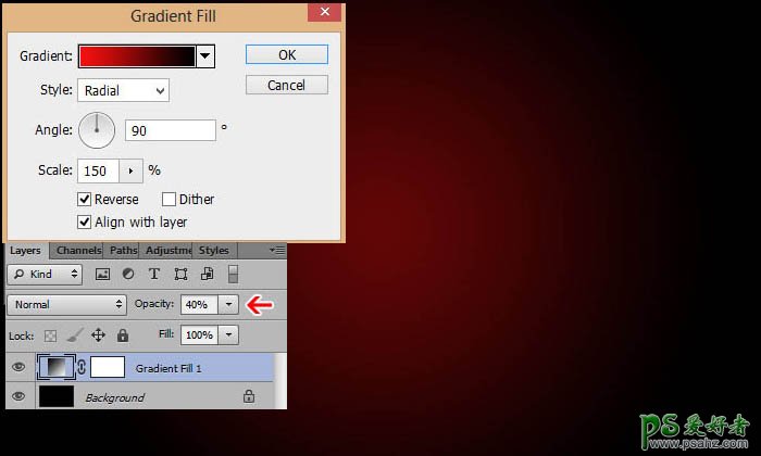 1、首先创建一个1000x600px的背景,填充黑色。添加一个径向渐变图层,参数如图。完成后调整图层不透明度为40%。