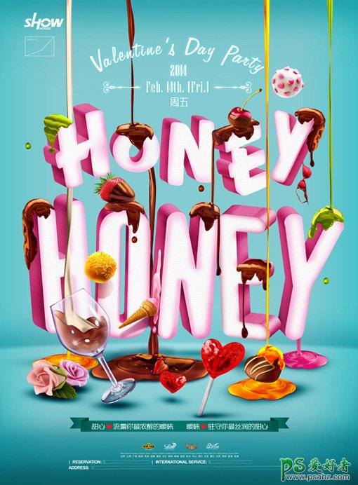 PS文字海报设计教程:创意制作漂亮的花体艺术字情人节派对海报,效果图版式非常大气,主体部分为立体字部分,非常显眼;文字上面加入了各种甜品,并做了一些融合处理,非常有甜蜜感;文字下面加入了一些相关的装饰,整体非常生动。 最终效果