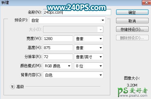 1、新建文件。打开PS软件,按Ctrl + N 新建画布,尺寸为1280 * 875,分辨率为72像素/英寸,然后确定。