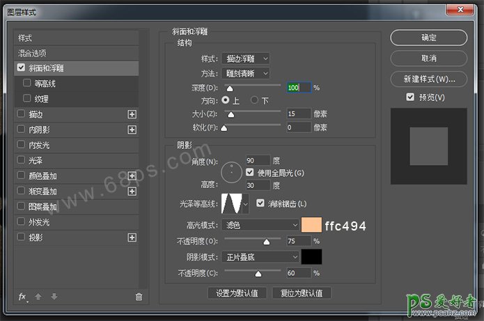 2、设置斜面和浮雕,如下图。