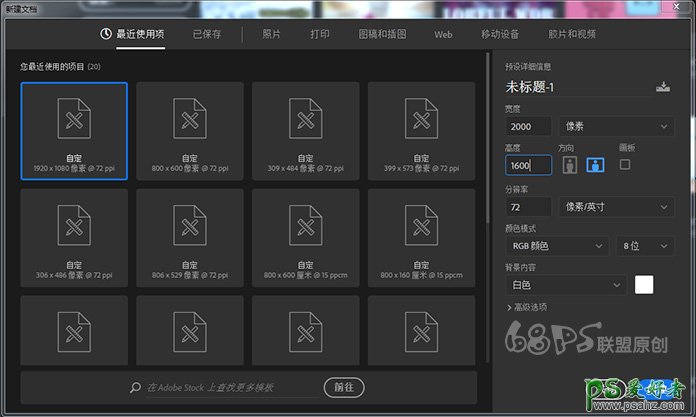 我们新建或Ctrl+N,创建2000x 1600像素大小,分辨率72像素/英寸,RGB颜色,8位,背景内容为白色的新文件 。大小也可以根据需要自己设定。