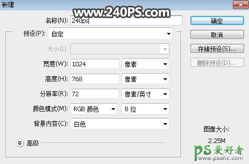 1、新建文件。打开PS软件,按Ctrl + N 新建,尺寸为1024 * 768像素,分辨率为72像素/英寸,如下图。