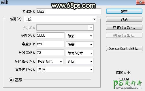 1、新建一个1000 * 650像素,分辨率为72像素/英寸的画布,如下图,然后确定。