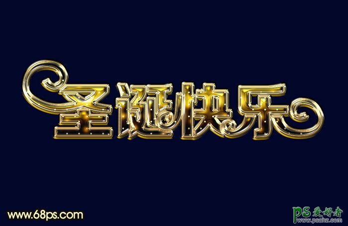 Photoshop制作华丽大气的圣诞节金属立体字,圣诞快乐艺术字体,效果字用到的图层样式比较多,底部用斜面和浮雕增加了立体面;中间部分用多个图层样式增加了纹理,质感,浮雕等效果;边缘部分用描边及斜面和浮雕增加了金属边框。 最终效果