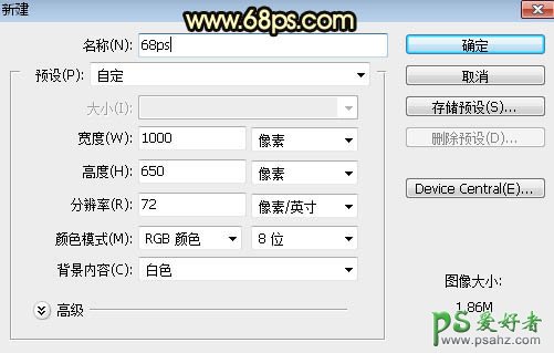 1、新建一个1000 * 650像素,分辨率为:72像素/英寸的画笔,如下图。
