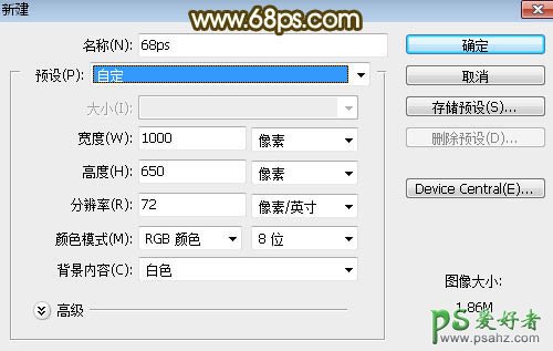 1、打开PS软件,按Ctrl + N 新建画布,尺寸为1000 * 650像素,分辨率为72像素/英寸,如下图,然后确定。