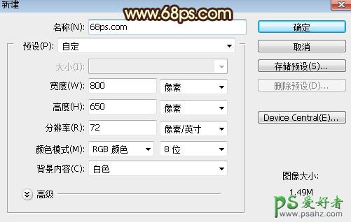1、打开PS软件,按Ctrl + N 新建文件,尺寸为800 * 650 像素,分辨率为:72像素/英寸,如下图,然后确定。