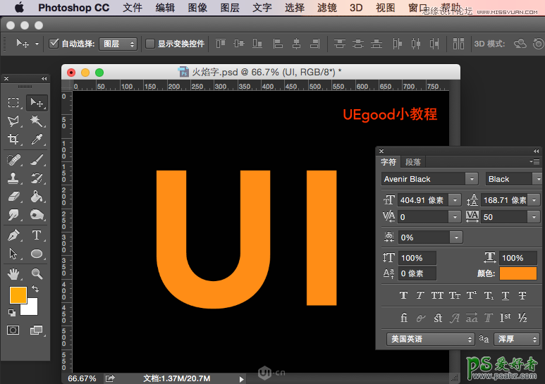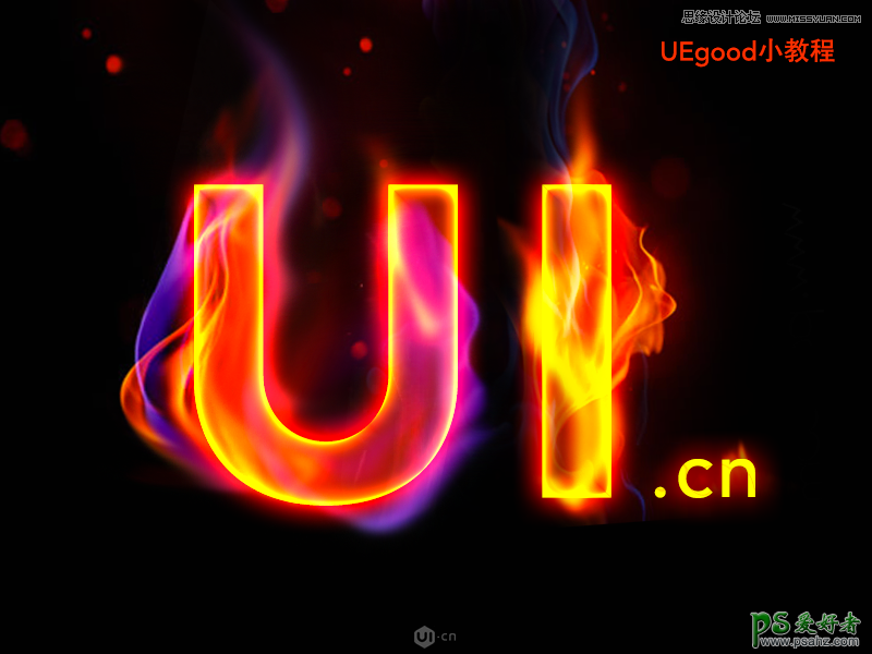 PS火焰字效制作教程:设计逼真的金属火焰燃烧字体,火焰特效字体,火光字效,实例中主要使用图层样式及图层模式叠加做火焰特效字,最终效果 1、使用T文字工具输入UI英文字,颜色选为橙黄色。 2、为文字图层添加红色的外发光。 效果如上 3、为