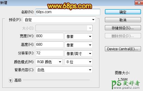 1、打开PS,按Ctrl + N 新建画布,尺寸为:800 * 680像素,分辨率为:72像素/英寸,如下图。