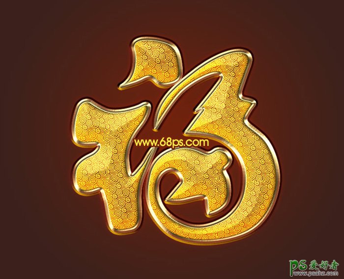 Photoshop设计华丽大气的金色祥云纹理效果的福字,金色立体质感的福字。实例中我们的设计师运用到的祥云图案素材,再用图层样式加上金色边框、浮雕、发光等效果。