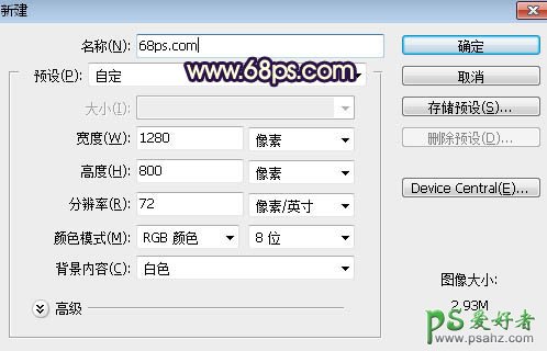 1、打开PS软件,按Ctrl + N 新建画布,尺寸为1280 * 800像素,分辨率为:72像素/英寸,如下图。