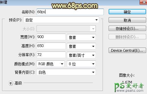 1、打开PS软件,按Ctrl + N 新建,尺寸为900 * 650像素,分辨率为72像素/英寸,如下图。