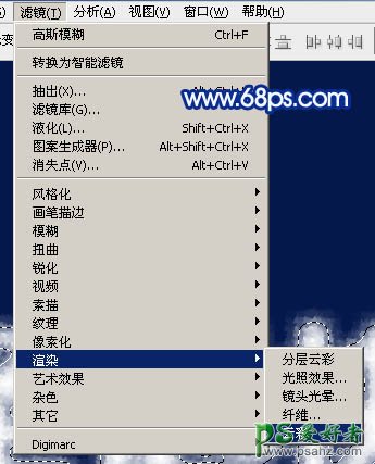 19、选择菜单:滤镜 > 渲染 > 云彩,如下图。