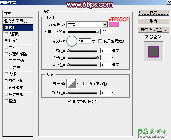 投影:颜色为紫红色:#FF65CE,角度为90度,其它设置如下图。