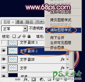 9、按Ctrl + J 把当前图层复制一层,得到“文字副本2”图层。然后在图层面板“文字副本2”缩略图区域右键,选择“清除图层样式”,如下图。