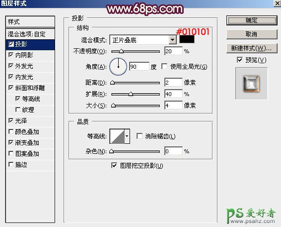 投影:混合模式“正片叠底”,颜色为:#010101,其它设置如下图。
