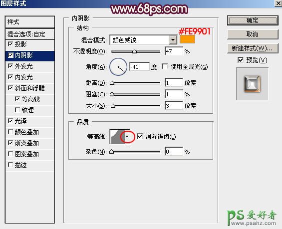 内阴影:混合模式“颜色减淡”,颜色为橙色:#FE9901,其它设置如下图。然后点击等高线的下拉小三角,选择等高线,如下图。