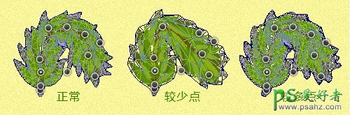 还是那段常青树枝,我执行了操控变形。上面的三个图是三种模式,图没选好,正常模式和刚性模式看不大出区别,凑和看吧。正常模式是默认的模式,正常的变形,柔和的过渡,而刚性模式,意思是变形会更为硬一些,过渡不会那么的柔和,毕竟要MAN一些。最后一个,扭曲模式,这个模式更适合校正使用,在变形的同时会产生一些透视效果。