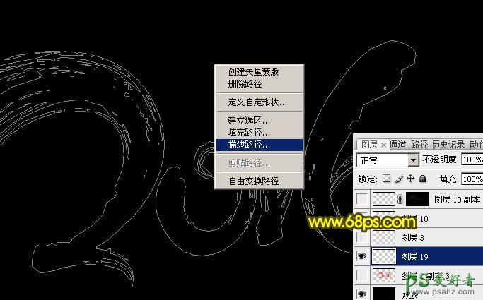 9、选择钢笔工具,在画布区域内右键,选择“描边路径”,如下图。
