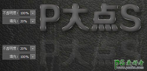 6、接下来,我们首先将P大点S拷贝图层的填充设置为0%,也许有人要问,填充和不透明度不是一样吗,其实,有很大的差别,从图层样式的设置你就可以清楚的看到区别所在。 如果你对图层设置了图层样式,将填充改为0,图层样式会照样显示,而原图层本身不会显示,如果调整透明度的话,是连带图层样式的效果一起调整的,你设置的图层样式也会跟着变透明。这里用一张图来解释一下,直观一些。