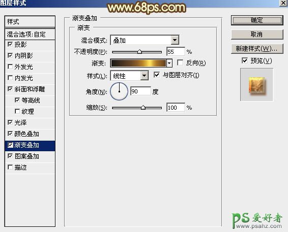 渐变叠加:混合模式为“叠加”。 ,然后再设置渐变色,如图22,其它设置如图21。