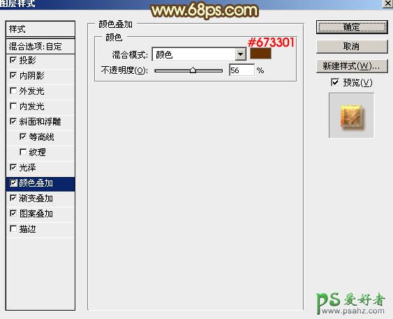 颜色叠加:混合模式“颜色”,颜色为暗红色:673301,其它设置如下图。