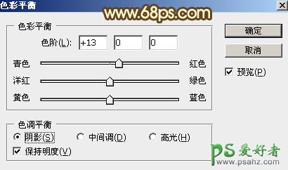 17、创建色彩平衡调整图层,对阴影,高光进行调整,参数及效果如下图。