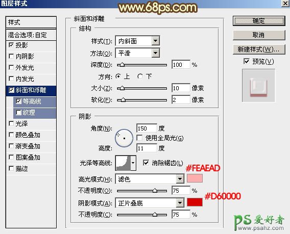 斜面和浮雕:高光颜色:#feaead,阴影颜色:#d60000,其它设置如下图。