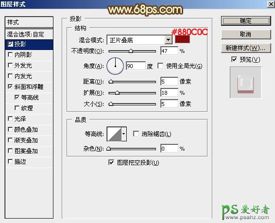 7、双击当前图层缩略图,调出图层样式设置面板,然后设置参数。 投影:混合模式“正片叠底”,颜色为暗红色:#880C0C,其它设置如下图。