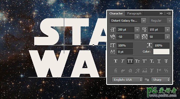 6、接下来调整各个字母之间的字间距。选定两个字母进行设置,设置如下:S和T字间距-50点,AR字间距50点,RS字间距-50点。