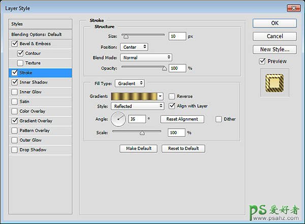 点击添加描边。设置大小10像素、位置居中、填充类型为渐变、样式为反射、角度35度。使用Golden Dial Top X11渐变填充,然后点击渐变编辑器,将颜色#f5e5a6替换为#e1ca71。